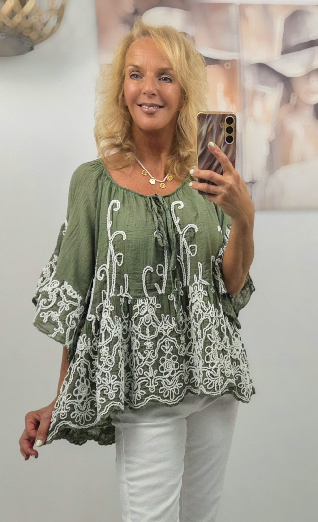 Mooie blouse die aan de voorkant iets korter valt dan aan de achterkant.