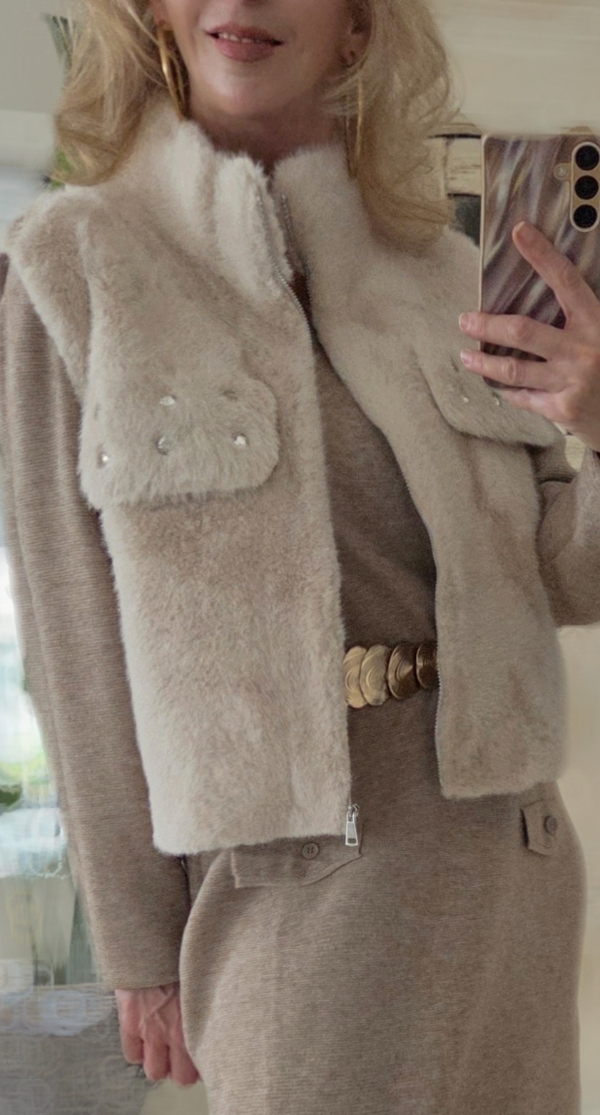 Superzacht gilet in beige afgezet op de klepjes met rhinestones.